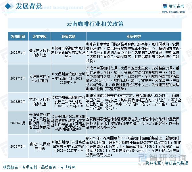 注:本文节选出自智研咨询发布的《研判2025!云南咖啡产区分布、发展历程、产业链、市场政策、生产现状、竞争格局及发展趋势分析:种植规模持续扩大[图]》行业分析文章,如需获取行业文章全部内容,可进入智研咨询搜索查看。