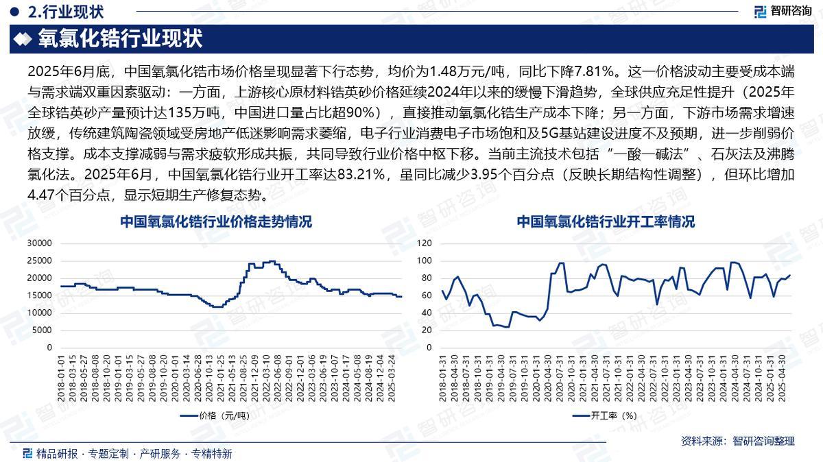 中国氧氯化锆行业作为全球最大生产国和出口国,2025年上半年呈现"量减价跌"与"质升效增"并存态势。消费量8.46万吨,同比下降23.99%,主要受陶瓷、耐火材料等传统行业需求萎缩影响;市场均价1.48万元/吨,同比下降7.81%,源于锆英砂全球供应充足(产量预计135万吨,中国进口占比超90%)及房地产低迷、消费电子饱和导致的需求疲软。现阶段,行业通过技术升级实现突围。主流工艺优化至"电熔锆+氧氯化锆"一体化生产,单位能耗降低20%;产品纯度提升至99.99%以上,高纯氧氯化锆(纯度≥99.99%)产能快速扩张,应用于5G陶瓷滤波器、固态电池等高端领域,售价较普通产品高30%,拉高整体毛利润。2025年6月行业毛利润达3694.25元/吨,同比增长4.88%,受益于锆英砂价格下滑、工业电价下调及环保成本分摊。此外,库存管理效率显著提升,库存量同比锐减48.43%至820吨,周转天数压缩至38天,资产运营效率增强。技术驱动的产业升级有效缓解产能过剩压力,成为行业应对传统需求收缩、维持运营效率的关键支撑。