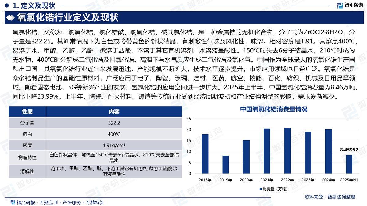 《2025-2031年中国氧氯化锆行业市场供需态势及前景战略研判报告》基于最新、最全的中国产业链数据,融合权威官方统计、深度企业调研、资本市场洞察及全球信息,通过严格的智能处理和独家算法验证,确保分析结论高度可靠、透明且可追溯。