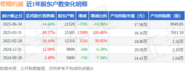 从股价来看,2025年3月31日至2025年6月30日,奇精机械区间跌幅为14.44%,在此期间股东户数减少3785.0户,减幅为14.96%。