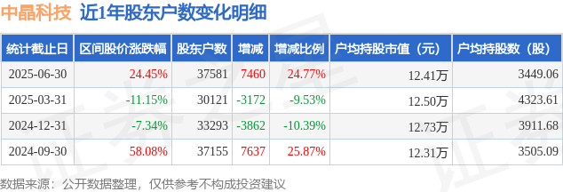 从股价来看,2025年3月31日至2025年6月30日,中晶科技区间涨幅为24.45%,在此期间股东户数增加7460.0户,增幅为24.77%。