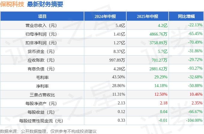据证券之星公开数据整理,近期保税科技(600794)发布2025年中报。根据财报显示,保税科技净利润同比下降65.45%。截至本报告期末,公司营业总收入4.2亿元,同比下降22.13%,归母净利润4866.76万元,同比下降65.45%。按单季度数据看,第二季度营业总收入1.92亿元,同比下降24.43%,第二季度归母净利润1793.42万元,同比下降73.19%。
