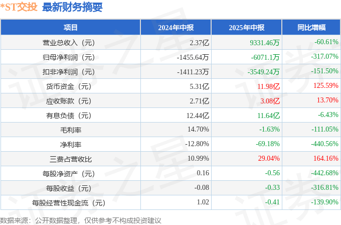 据证券之星公开数据整理,近期*ST交投(002200)发布2025年中报。截至本报告期末,公司营业总收入9331.46万元,同比下降60.61%,归母净利润-6071.1万元,同比下降317.07%。按单季度数据看,第二季度营业总收入1708.4万元,同比下降86.94%,第二季度归母净利润-5960.91万元,同比下降229.67%。本报告期*ST交投三费占比上升明显,财务费用、销售费用和管理费用总和占总营收同比增幅达157.51%。