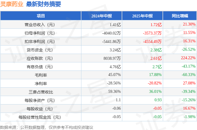 据证券之星公开数据整理,近期灵康药业(维权)(603669)发布2025年中报。根据财报显示,灵康药业营收上升亏损收窄。截至本报告期末,公司营业总收入1.72亿元,同比上升21.3%,归母净利润-3573.37万元,同比上升11.55%。按单季度数据看,第二季度营业总收入1.21亿元,同比上升88.01%,第二季度归母净利润-1711.24万元,同比上升29.75%。