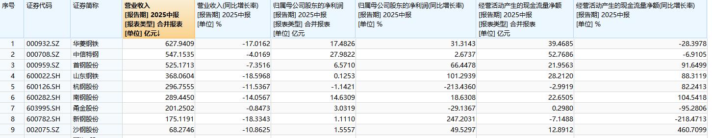 新钢股份的经营数据表现,只是国内钢铁行业上半年经营情况的一个缩影。Wind数据显示,按照中上协行业类(2023)标准,截至8月22日,国内已有9家钢铁企业发布中报,企业营业收入均同比下滑,其中7家企业盈利同比增长。