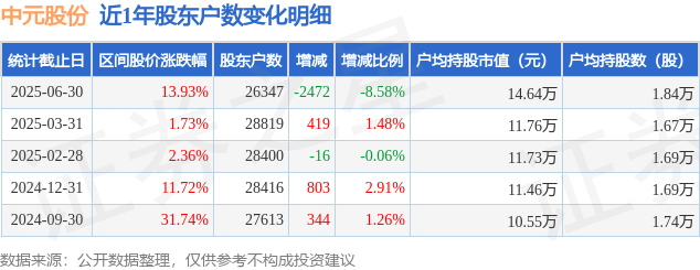 证券之星消息,近日中元股份披露,截至2025年6月30日公司股东户数为2.63万户,较3月31日减少2472.0户,减幅为8.58%。户均持股数量由上期的1.67万股增加至1.84万股,户均持股市值为14.64万元。