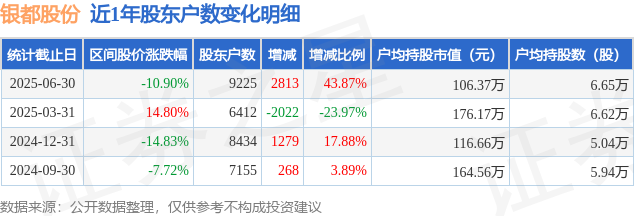从股价来看,2025年3月31日至2025年6月30日,银都股份区间跌幅为10.9%,在此期间股东户数增加2813.0户,增幅为43.87%。