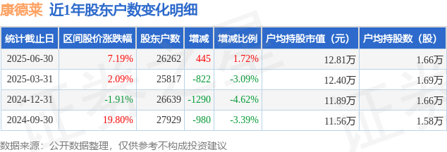 从股价来看,2025年3月31日至2025年6月30日,康德莱区间涨幅为7.19%,在此期间股东户数增加445.0户,增幅为1.72%。