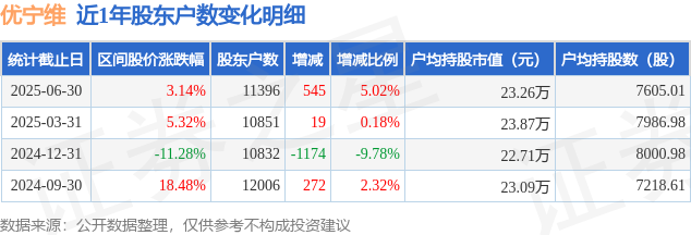 从股价来看,2025年3月31日至2025年6月30日,优宁维区间涨幅为3.14%,在此期间股东户数增加545.0户,增幅为5.02%。