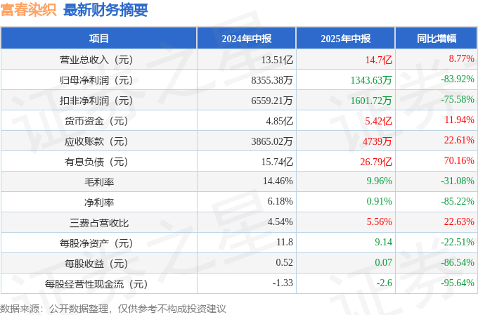 据证券之星公开数据整理,近期富春染织(605189)发布2025年中报。截至本报告期末,公司营业总收入14.7亿元,同比上升8.77%,归母净利润1343.63万元,同比下降83.92%。按单季度数据看,第二季度营业总收入8.0亿元,同比下降1.73%,第二季度归母净利润860.1万元,同比下降84.08%。本报告期富春染织存货明显上升,存货同比增幅达84.01%。