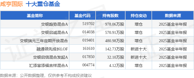 持有咸亨国际最多的基金为交银趋势混合A,目前规模为38.22亿元,最新净值4.8833(8月26日),较上一交易日上涨0.63%,近一年上涨28.92%。该基金现任基金经理为杨金金。