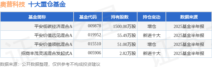 持有奥普科技最多的基金为平安低碳经济混合A,目前规模为14.27亿元,最新净值1.1858(8月26日),较上一交易日上涨0.44%,近一年上涨54.24%。该基金现任基金经理为何杰。