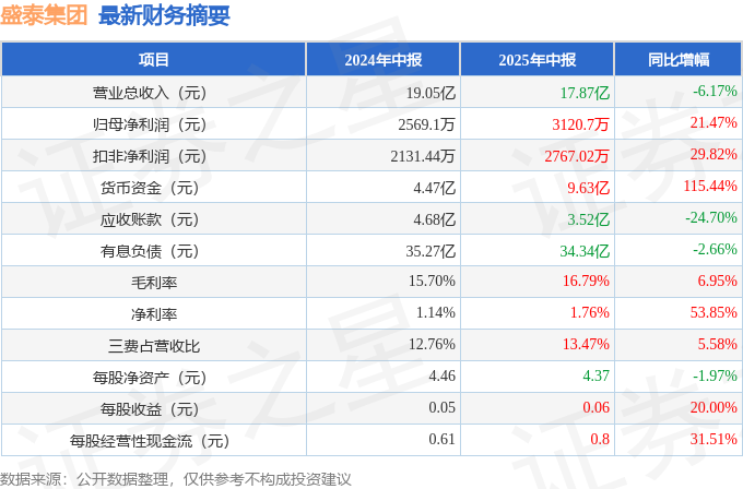 据证券之星公开数据整理,近期盛泰集团(605138)发布2025年中报。截至本报告期末,公司营业总收入17.87亿元,同比下降6.17%,归母净利润3120.7万元,同比上升21.47%。按单季度数据看,第二季度营业总收入8.84亿元,同比下降1.86%,第二季度归母净利润1083.28万元,同比下降42.69%。本报告期盛泰集团盈利能力上升,毛利率同比增幅6.95%,净利率同比增幅53.85%。