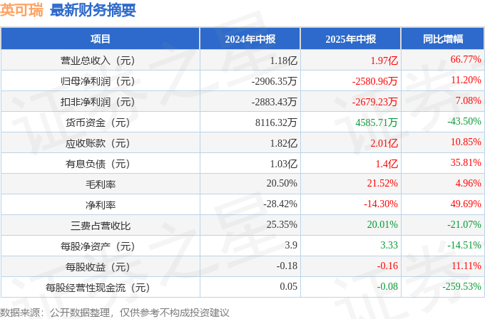 据证券之星公开数据整理,近期英可瑞(300713)发布2025年中报。截至本报告期末,公司营业总收入1.97亿元,同比上升66.77%,归母净利润-2580.96万元,同比上升11.2%。按单季度数据看,第二季度营业总收入1.15亿元,同比上升64.08%,第二季度归母净利润-1645.68万元,同比下降11.4%。本报告期英可瑞存货明显上升,存货同比增幅达58.68%。