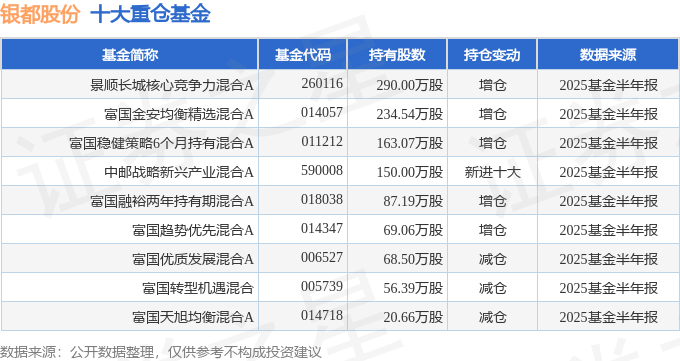 持有银都股份最多的基金为景顺长城核心竞争力混合A,目前规模为12.75亿元,最新净值3.485(8月26日),较上一交易日下跌0.29%,近一年上涨20.84%。该基金现任基金经理为余广。