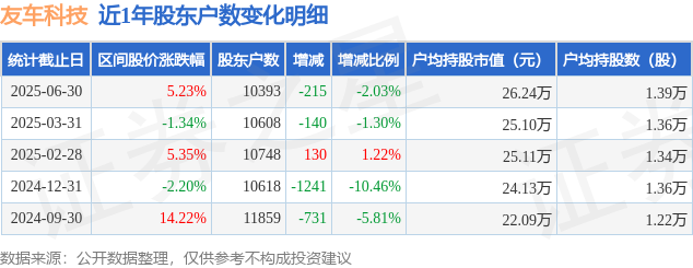 从股价来看,2025年3月31日至2025年6月30日,友车科技区间涨幅为5.23%,在此期间股东户数减少215.0户,减幅为2.03%。