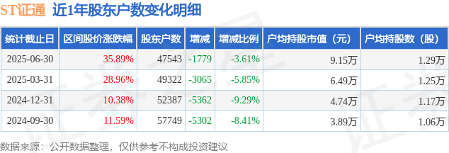 从股价来看,2025年3月31日至2025年6月30日,ST证通区间涨幅为35.89%,在此期间股东户数减少1779.0户,减幅为3.61%。