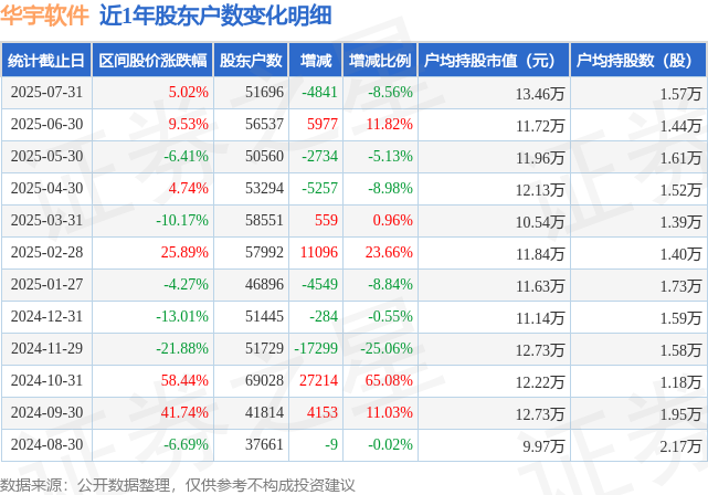 从股价来看,2025年6月30日至2025年7月31日,华宇软件区间涨幅为5.02%,在此期间股东户数减少4841.0户,减幅为8.56%。