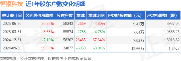 从股价来看,2025年3月31日至2025年6月30日,恒银科技区间涨幅为30.35%,在此期间股东户数增加2669.0户,增幅为4.8%。