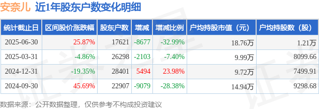 从股价来看,2025年3月31日至2025年6月30日,安奈儿区间涨幅为25.87%,在此期间股东户数减少8677.0户,减幅为32.99%。