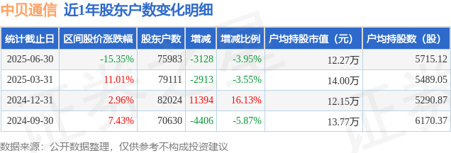 从股价来看,2025年3月31日至2025年6月30日,中贝通信区间跌幅为15.35%,在此期间股东户数减少3128.0户,减幅为3.95%。