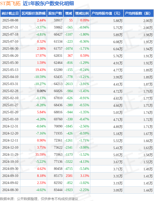 从股价来看,2025年7月31日至2025年8月8日,ST英飞拓区间涨幅为2.44%,在此期间股东户数增加55.0户,增幅为0.09%。