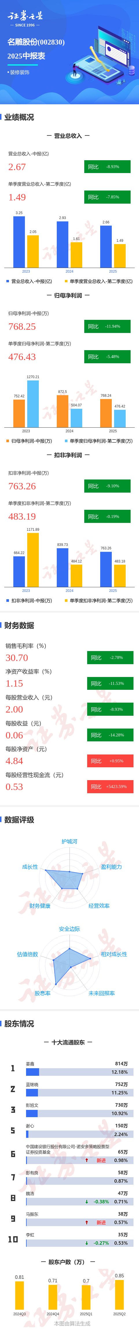 证券之星消息,名雕股份2025年中报显示,公司主营收入2.67亿元,同比下降8.93%;归母净利润768.25万元,同比下降11.95%;扣非净利润763.26万元,同比下降9.11%;其中2025年第二季度,公司单季度主营收入1.49亿元,同比下降7.85%;单季度归母净利润476.43万元,同比下降5.48%;单季度扣非净利润483.19万元,同比下降0.19%;负债率52.85%,投资收益149.39万元,财务费用-7.01万元,毛利率30.7%。