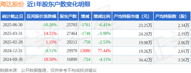 从股价来看,2025年3月31日至2025年6月30日,海达股份区间跌幅为10.2%,在此期间股东户数减少1761.0户,减幅为6.41%。