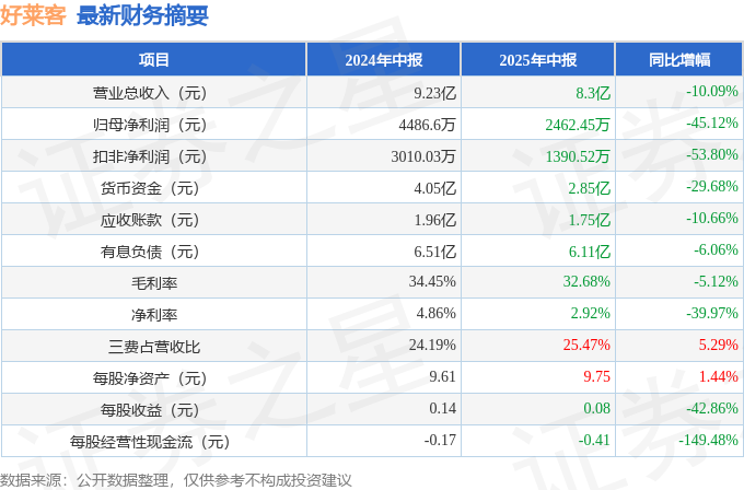 据证券之星公开数据整理,近期好莱客(603898)发布2025年中报。截至本报告期末,公司营业总收入8.3亿元,同比下降10.09%,归母净利润2462.45万元,同比下降45.12%。按单季度数据看,第二季度营业总收入4.39亿元,同比下降15.56%,第二季度归母净利润2242.38万元,同比下降30.4%。本报告期好莱客公司应收账款体量较大,当期应收账款占最新年报归母净利润比达217.03%。