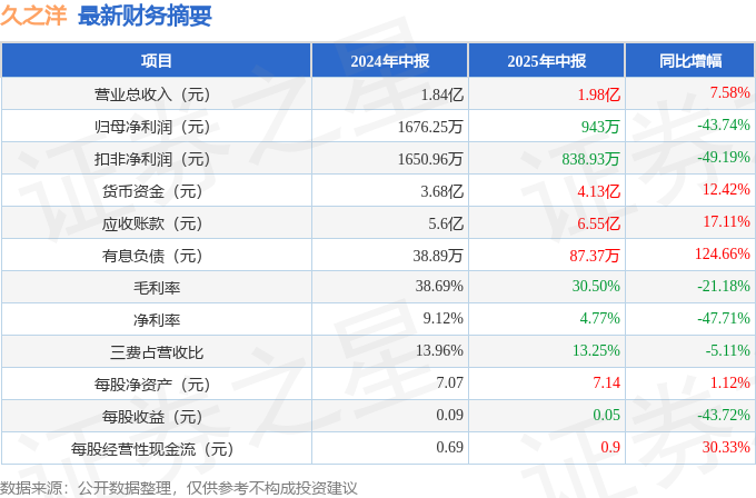 据证券之星公开数据整理,近期久之洋(300516)发布2025年中报。截至本报告期末,公司营业总收入1.98亿元,同比上升7.58%,归母净利润943.0万元,同比下降43.74%。按单季度数据看,第二季度营业总收入1.31亿元,同比上升8.6%,第二季度归母净利润1533.75万元,同比上升22.83%。本报告期久之洋公司应收账款体量较大,当期应收账款占最新年报归母净利润比达2115.78%。