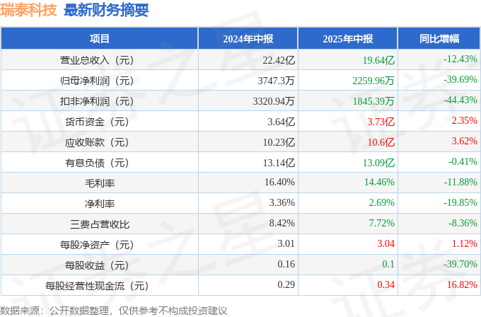 据证券之星公开数据整理,近期瑞泰科技(002066)发布2025年中报。截至本报告期末,公司营业总收入19.64亿元,同比下降12.43%,归母净利润2259.96万元,同比下降39.69%。按单季度数据看,第二季度营业总收入9.83亿元,同比下降11.12%,第二季度归母净利润611.42万元,同比下降59.38%。本报告期瑞泰科技公司应收账款体量较大,当期应收账款占最新年报归母净利润比达1859.4%。
