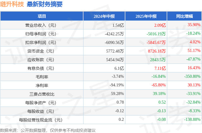 据证券之星公开数据整理,近期琏升科技(300051)发布2025年中报。截至本报告期末,公司营业总收入2.09亿元,同比上升35.9%,归母净利润-5016.19万元,同比下降18.24%。按单季度数据看,第二季度营业总收入1.1亿元,同比上升10.84%,第二季度归母净利润-2686.66万元,同比下降92.8%。本报告期琏升科技短期债务压力上升,流动比率达0.3。
