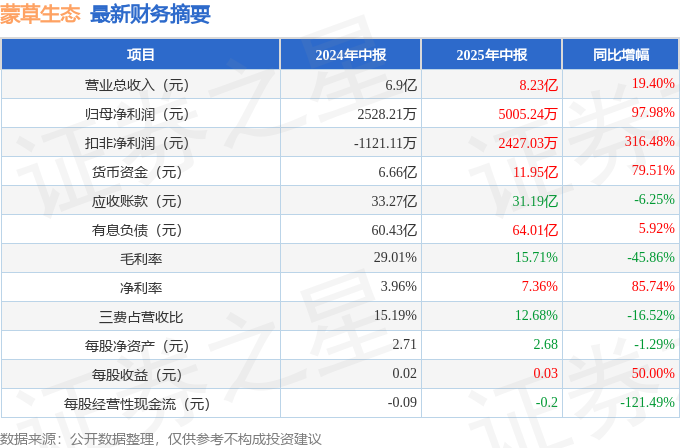 据证券之星公开数据整理,近期蒙草生态(300355)发布2025年中报。截至本报告期末,公司营业总收入8.23亿元,同比上升19.4%,归母净利润5005.24万元,同比上升97.98%。按单季度数据看,第二季度营业总收入6.14亿元,同比上升16.69%,第二季度归母净利润6698.66万元,同比上升22.7%。本报告期蒙草生态公司应收账款体量较大,当期应收账款占最新年报归母净利润比达8815.48%。