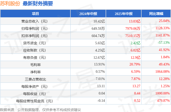 据证券之星公开数据整理,近期苏利股份(603585)发布2025年中报。截至本报告期末,公司营业总收入13.03亿元,同比上升25.04%,归母净利润7979.06万元,同比上升1128.33%。按单季度数据看,第二季度营业总收入6.55亿元,同比上升17.82%,第二季度归母净利润4565.78万元,同比上升374.9%。本报告期苏利股份盈利能力上升,毛利率同比增幅49.43%,净利率同比增幅1064.08%。