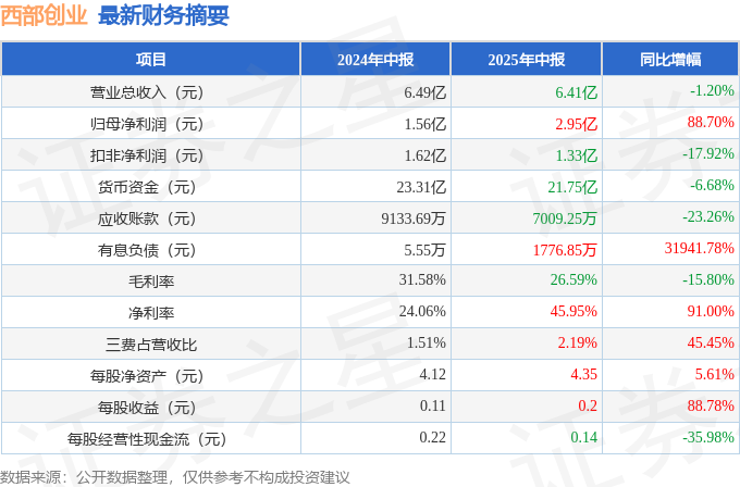 据证券之星公开数据整理,近期西部创业(000557)发布2025年中报。根据财报显示,西部创业净利润同比增长88.7%。截至本报告期末,公司营业总收入6.41亿元,同比下降1.2%,归母净利润2.95亿元,同比上升88.7%。按单季度数据看,第二季度营业总收入3.23亿元,同比上升0.67%,第二季度归母净利润2.29亿元,同比上升218.75%。