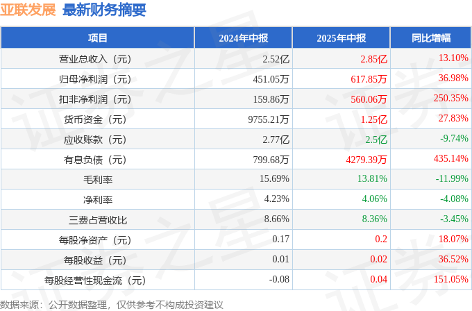 据证券之星公开数据整理,近期亚联发展(维权)(002316)发布2025年中报。根据财报显示,亚联发展营收净利润同比双双增长。截至本报告期末,公司营业总收入2.85亿元,同比上升13.1%,归母净利润617.85万元,同比上升36.98%。按单季度数据看,第二季度营业总收入1.8亿元,同比上升6.74%,第二季度归母净利润276.32万元,同比下降5.0%。
