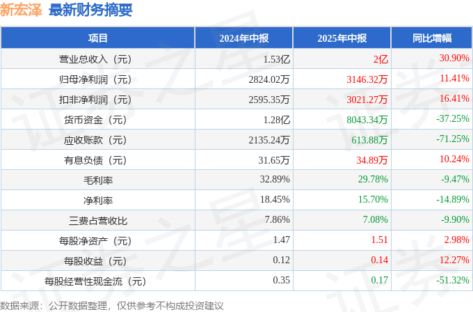 据证券之星公开数据整理,近期新宏泽(维权)(002836)发布2025年中报。根据财报显示,新宏泽营收净利润同比双双增长。截至本报告期末,公司营业总收入2.0亿元,同比上升30.9%,归母净利润3146.32万元,同比上升11.41%。按单季度数据看,第二季度营业总收入9920.49万元,同比上升16.3%,第二季度归母净利润1545.58万元,同比下降12.44%。