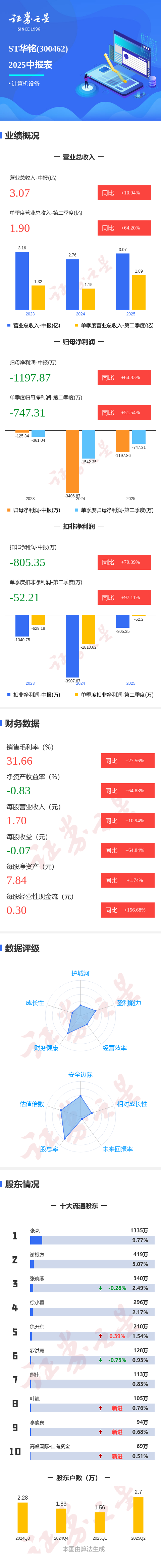 证券之星消息,ST华铭(维权)2025年中报显示,公司主营收入3.07亿元,同比上升10.95%;归母净利润-1197.87万元,同比上升64.84%;扣非净利润-805.35万元,同比上升79.39%;其中2025年第二季度,公司单季度主营收入1.9亿元,同比上升64.21%;单季度归母净利润-747.31万元,同比上升51.55%;单季度扣非净利润-52.21万元,同比上升97.12%;负债率31.09%,投资收益417.6万元,财务费用126.15万元,毛利率31.66%。