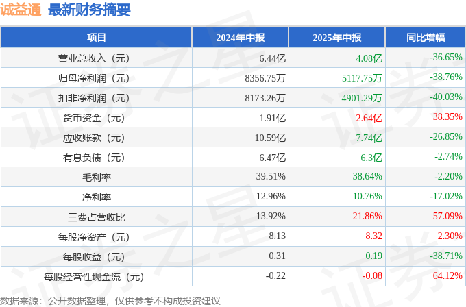 据证券之星公开数据整理,近期诚益通(300430)发布2025年中报。截至本报告期末,公司营业总收入4.08亿元,同比下降36.65%,归母净利润5117.75万元,同比下降38.76%。按单季度数据看,第二季度营业总收入2.19亿元,同比下降41.81%,第二季度归母净利润3858.58万元,同比下降26.9%。本报告期诚益通三费占比上升明显,财务费用、销售费用和管理费用总和占总营收同比增幅达53.98%。