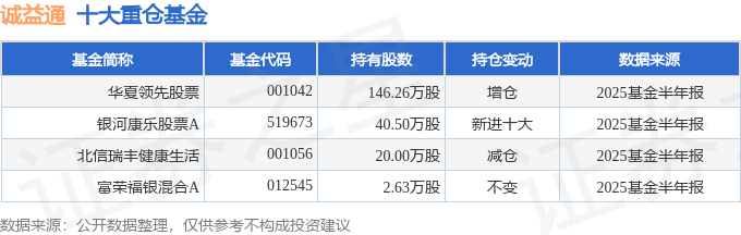 持有诚益通最多的基金为华夏领先股票,目前规模为7.04亿元,最新净值0.591(8月27日),较上一交易日下跌1.99%,近一年上涨38.73%。该基金现任基金经理为王晓李。