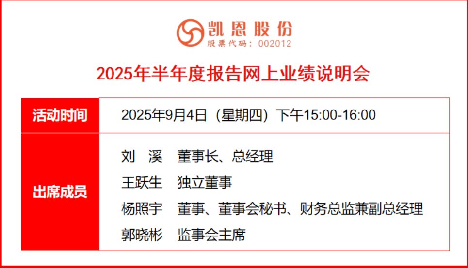 凯恩股份已于近日披露《2025年半年度报告》,为便于广大投资者更全面深入了解公司2025年半年度业绩和经营情况,公司定于2025年9月4日(星期四)下午15:00-16:00在全景网采用网络远程的方式举办2025年半年度报告网上业绩说明会。