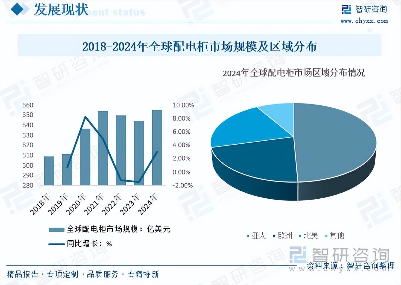 随着全球城市化进程的加快推进,以及新能源产业的迅猛发展,配电网设备市场正迎来前所未有的增长机遇。智慧电网技术的广泛应用、节能减排政策的大力推行,以及用户对供电可靠性日益提升的需求,都在全方位推动着配电网设备市场的技术革新与市场拓展。数据显示,2018年全球配电柜市场规模309.12亿美元,2024年全球配电柜市场规模增至355.74亿美元。亚太地区是全球配电柜市场的重要组成部分,占全球的比重达49.29%;其次是欧洲,占21.41%;北美占20.92%。