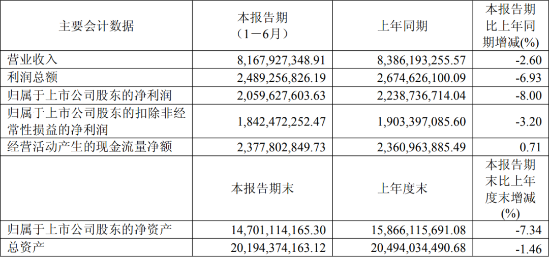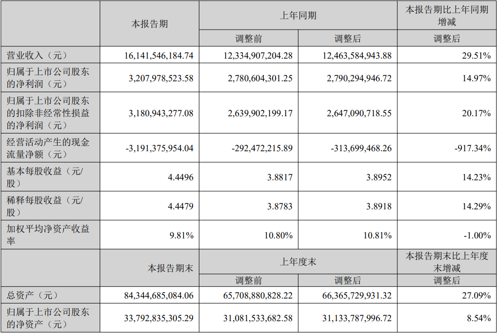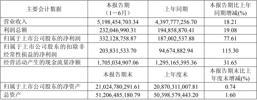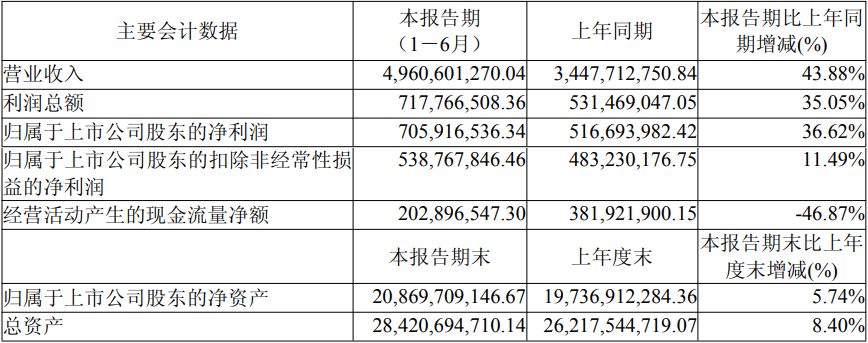 公司上半年实现营业收入161.42亿元,同比增长29.51%;归母净利润32.08亿元,同比增长14.97%。