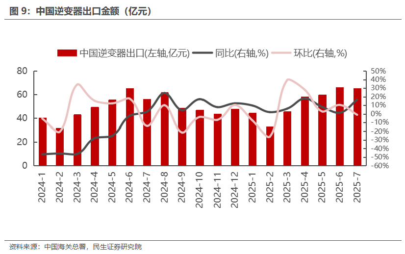 1)2025年8月,海关总署发布2025年7月光伏出口数据。根据海关总署数据, 2025年1-7月,国内逆变器出口金额为371.09亿元人民币,同比+8.87%,其中7月单月出口65.13亿元,同比+16.35%,环比-1.18%,细分市场来看,新兴市场仍然维持较高增速,沙特阿拉伯和乌克兰单月分别出口1.48/0.21亿元,同比+29.49%/14.98%。按出货地划分,广东省7月单月出口24.41亿元,同比+10.38%,环比+0.93%,浙江省单月出口15.43亿元,同比-3.26%,环比+7.97%,安徽省单月出口8.34亿元,同比+27.30%,环比+5.05%,江苏省单月出口9.87亿元,同比+93.94%,环比-5.92%。