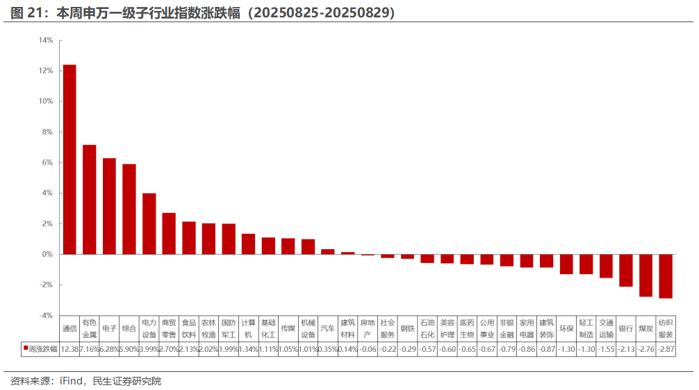 电力设备与新能源板块:本周上涨3.99%,涨跌幅排名第5,强于上证指数。沪指收于3857.93点,上涨32.17点,涨幅0.84%,成交62888.18亿元;深成指收于12696.15点,上涨530.09点,涨幅4.36%,成交84660.04亿元;创业板收于2890.13点,上涨207.57点,涨幅7.74%,成交41239.43亿元;电气设备收于8435.46点,上涨323.72点,涨幅3.99%,强于上证指数。
