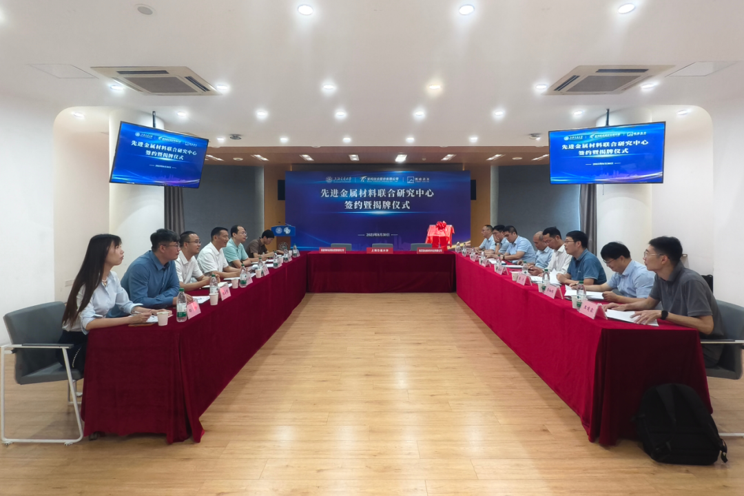 签约仪式前,王俭、张海龙一行同中国工程院院士、轻合金精密成型国家工程中心主任丁文江教授会谈,并参观了材料科学与工程学院展厅。