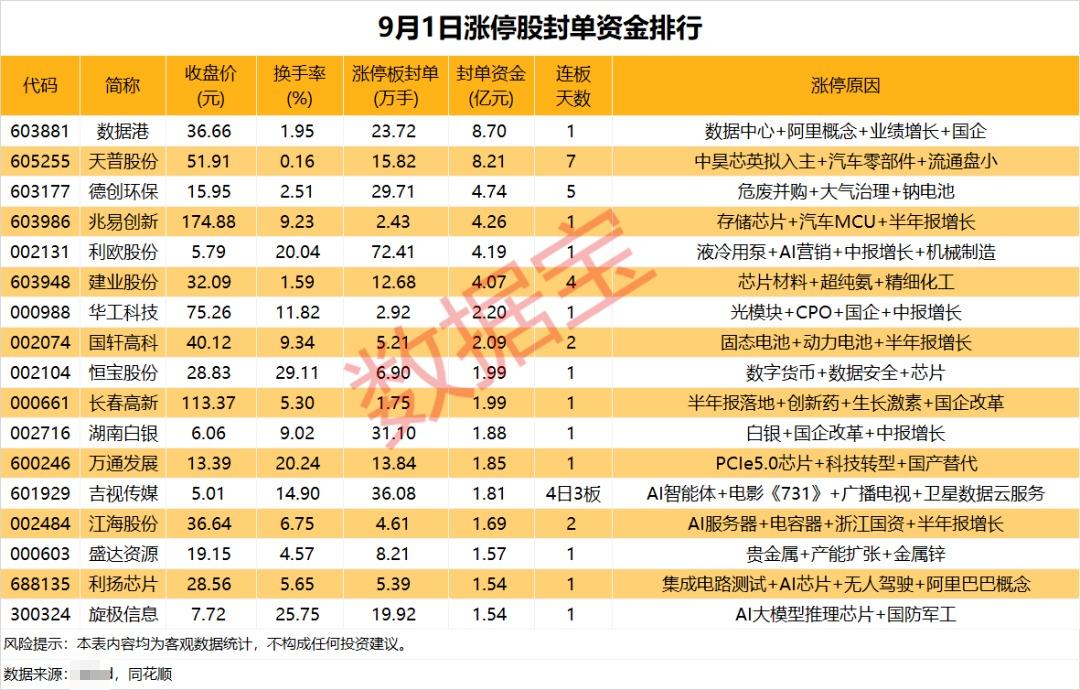 据证券时报·数据宝统计,9月1日,从收盘涨停板封单量看,利欧股份、山子高科、吉视传媒、湖南白银居前,依次有72.41万手、47.44万手、36.08万手、31.1万手;另有德创环保、兆新股份、合力泰(维权)、美晨科技(维权)等十余股封单量均在20万手以上。