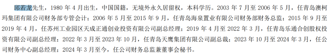 根据此前公司2024年年度报告披露,邱若龙2024年3月开始任公司财务总监兼董事会秘书,直至近期辞职。