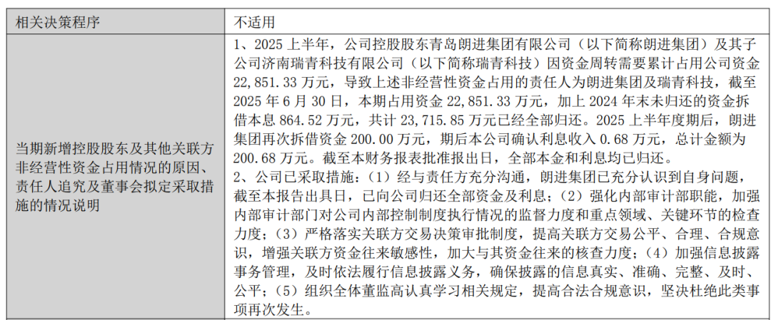 然而,2025年8月28日朗进科技公告《2025年半年度报告》显示,2025 上半年,公司控股股东青岛朗进集团有限公司(以下简称朗进集团)及其子公司济南瑞青科技有限公司(以下简称瑞青科技)因资金周转需要累计占用公司资金22,851.33万元,导致上述非经营性资金占用的责任人为朗进集团及瑞青科技,截至2025年6月30日,本期占用资金 22,851.33万元,加上2024 年末未归还的资金拆借本息 864.52万元,共计23,715.85万元已经全部归还。2025上半年度期后,朗进集团再次拆借资金200.00万元,期后本公司确认利息收入0.68 万元,总计金额为200.68 万元。截至本财务报表批准报出日,全部本金和利息均已归还。