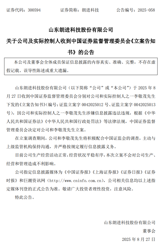 近日,朗进科技(维权)(300594)公告,公司于2025年8月 27 日收到中国证券监督管理委员会分别对公司和实际控制人之一李敬茂先生下发的《立案告知书》(编号:证监立案字 0042025012 号、证监立案字0042025013号),因公司和实际控制人之一李敬茂先生涉嫌信息披露违法违规,根据《中华人民共和国证券法》《中华人民共和国行政处罚法》等法律法规,中国证券监督管理委员会决定对公司和李敬茂先生立案。